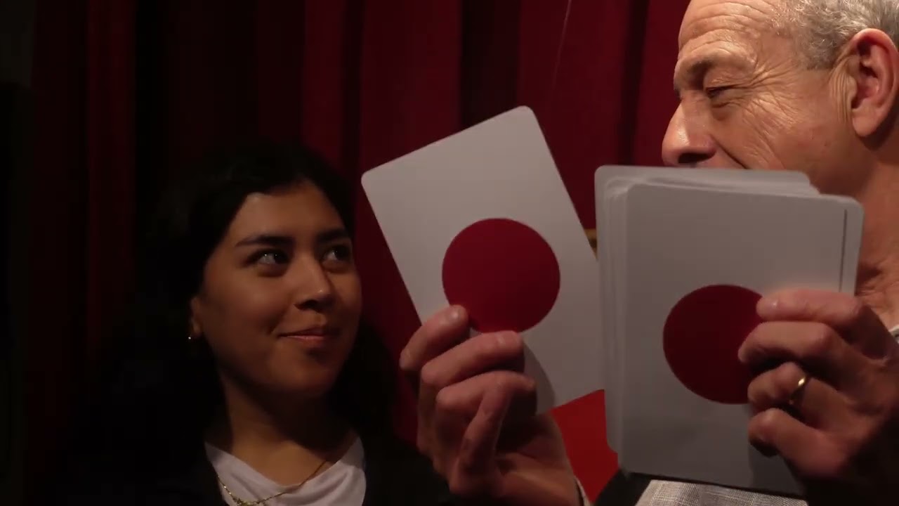 Em seguida, o mágico mostra diversas cartas grandes com bandeiras de diferentes países, dizendo os nomes dos países enquanto passa pelas cartas. Porém, o público percebe algo curioso: todas as cartas parecem mostrar a mesma bandeira da previsão inicial.